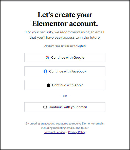 | Continue with your email | Create an account using your email address. You will then enter your email address, select a password and click Create account. In the future, use this email and password to login to Elementor. |