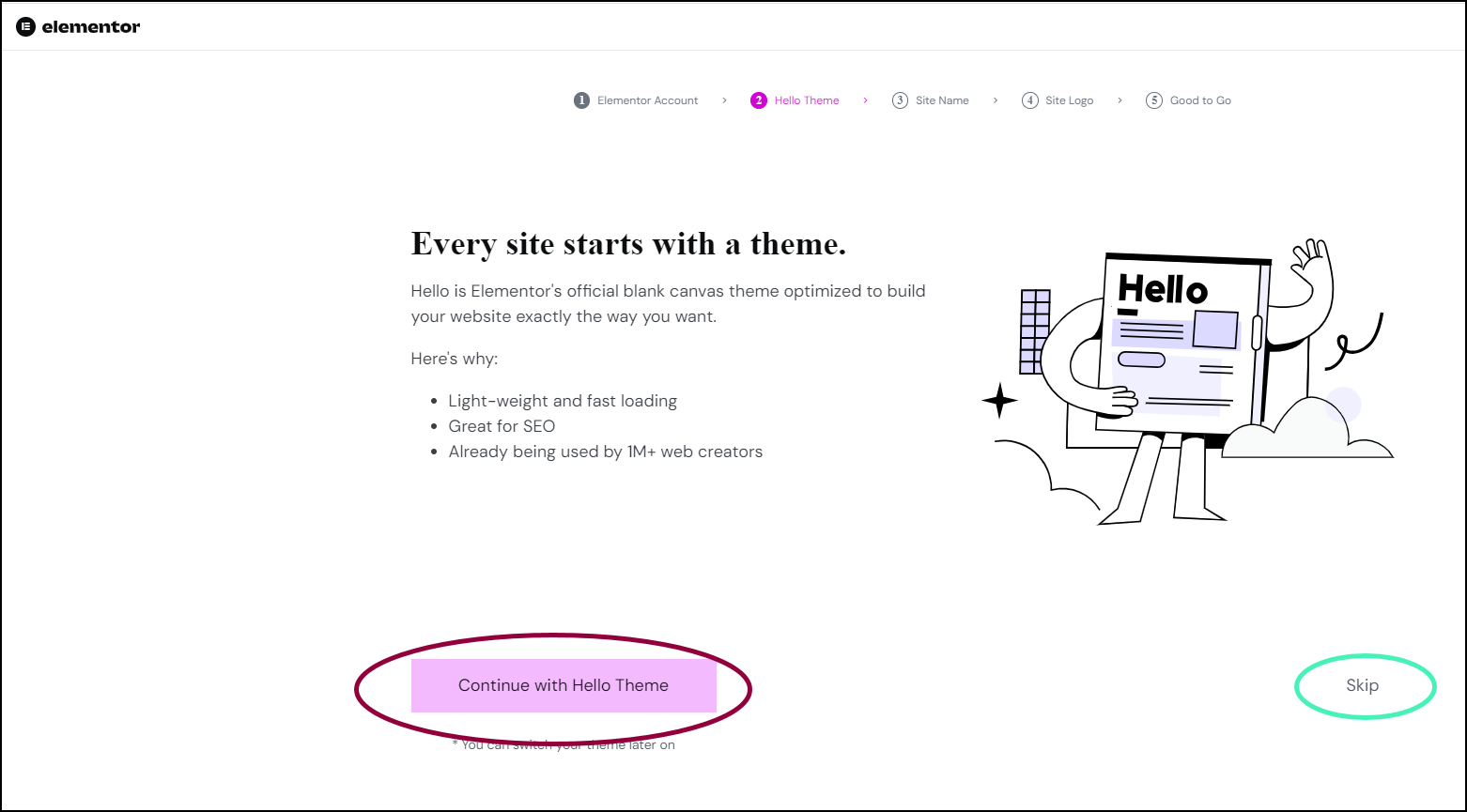 - Click Continue with Hello Theme to install the Hello theme.
