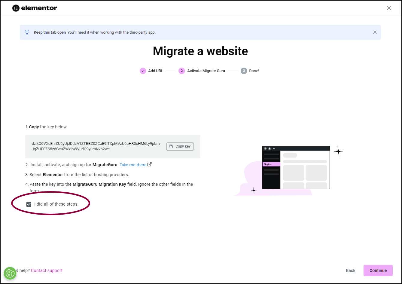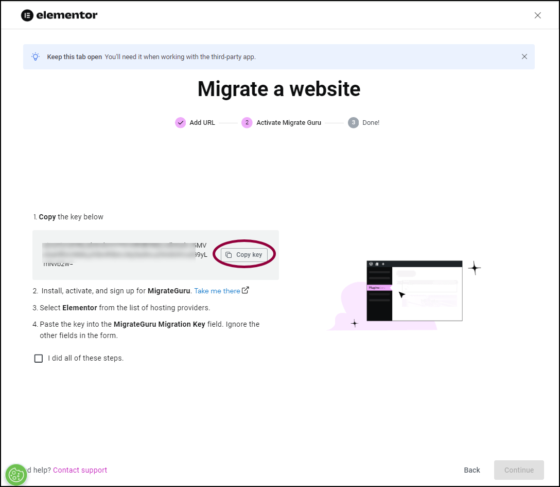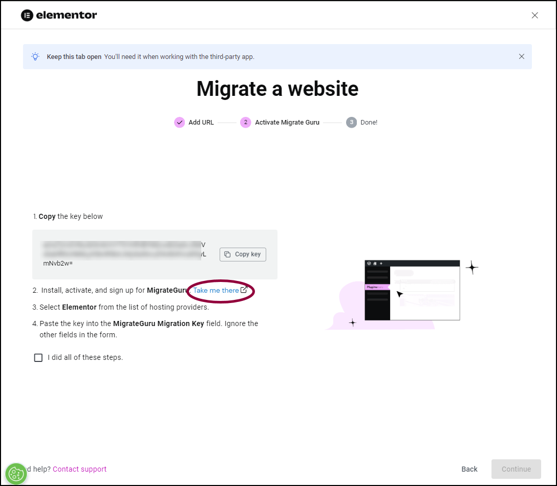 - Scroll down and click Yes I’ve installed it.NoteYou don’t actually need to install Migrate Guru on your destination site. Elementor takes care of this end of the process.