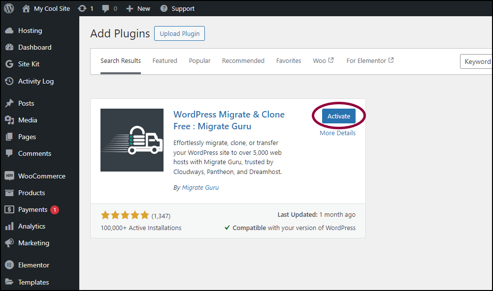 This will open your existing site in a separate tab, ready to install the Migrate Guru plugin. - Search for the Migrate Guru plugin. For details about installing new plugins, see Install WordPress plugins.