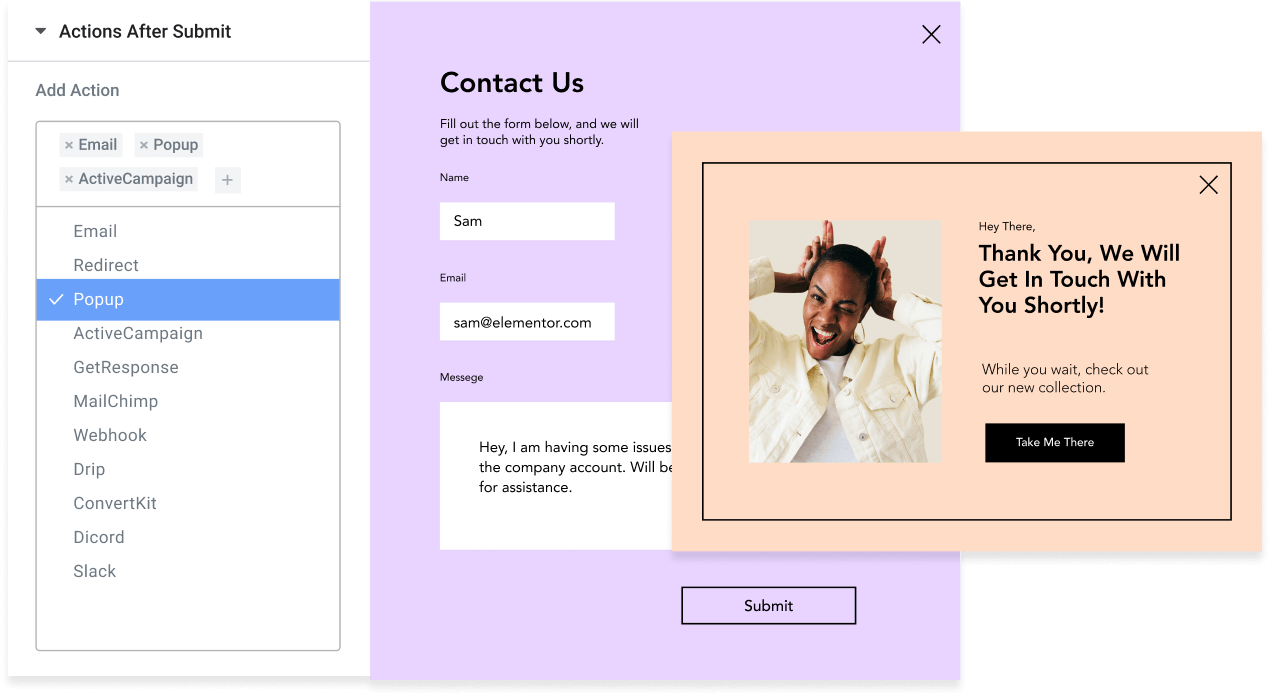 Decide what happens after your visitor hits “Submit”. Send an email notification to your visitor’s inbox, redirect them to a thank you page or your website, display an engaging popup, and more.