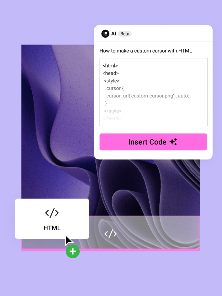 Make your website stand out with effects and other features using Elementor’s AI code assistant to add CSS, Code, JavaScript, or HTML to your website without having to write a single line of code yourself.